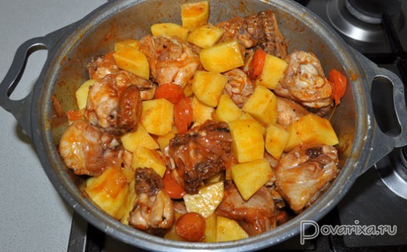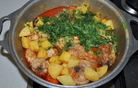 После закипания накрываем латку, снижаем огонь до небольшого и тушим картофель с курицей 20-25 минут. Посыпаем зеленью.