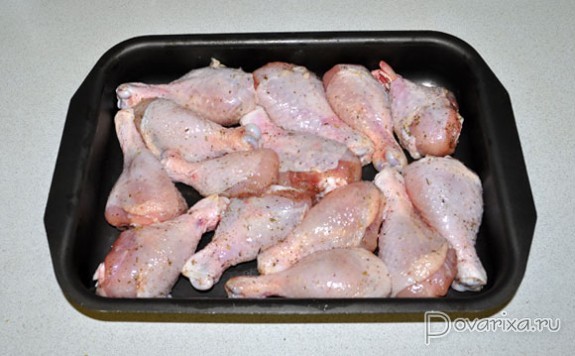Складываем голени в миску, посыпаем растертыми приправами, включая соль, поливаем растительным маслом, перемешиваем.