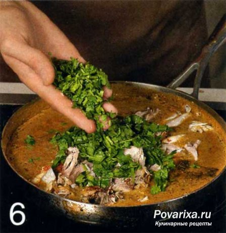 - Вымытую кинзу рубим не слишком мелко и засыпаем в сациви. Добавляем раздавленный чеснок. Перемешиваем. После остывания убираем в холодильник. Сациви подается холодным.