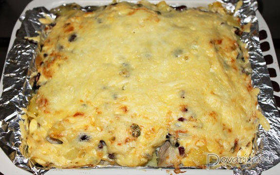 - Через 40 минут вынимаем форму, раскрываем аккуратно – можно обжечься паром! - и подворачиваем края фольги, посыпаем сыром и снова ставим в духовку на 15-20 минут.