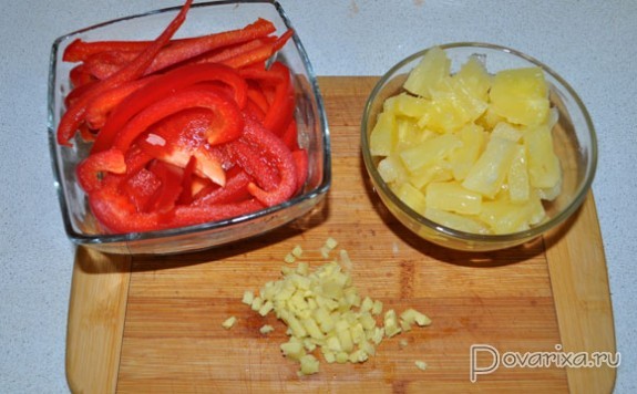 Пока мы это делаем, на самом сильном огне, в большой толстодонной сковороде (если у нас нет сковороды вок) перекаливаем налитое в нее масло. И начинаем обжаривать курицу, свободно располагая кусочки для быстрого обжаривания, все время перемешивая, тратя на каждую порцию (мы жарили в 3 приема) примерно 2 минуты. Т.е. мясо должно побелеть и только начинать браться корочкой.