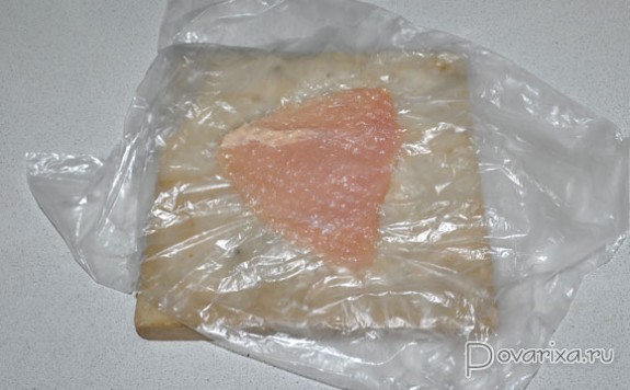 Для сохранения нежного куриного мяса кладем перед отбиванием кусок филе в пакет или между слоями пленки, а отбиваем деревянным молотком, не прикладывая лишних усилий, до толщины 5-7 мм.