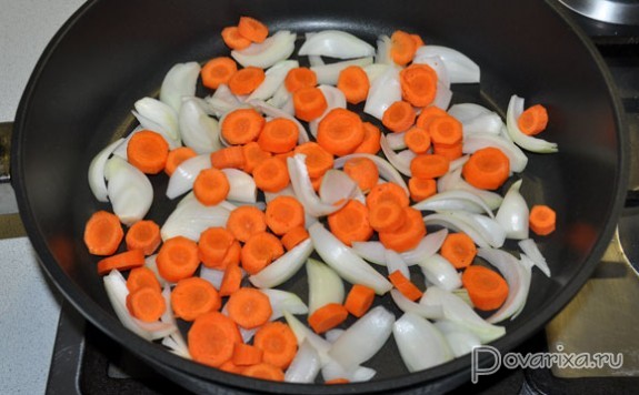 Кладем в сковороду или кастрюлю масло, засыпаем лук с морковью.