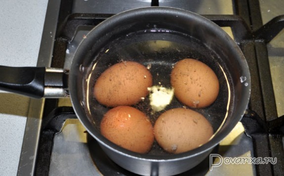 Ставим на конфорку ковшик, в котором варятся яйца.