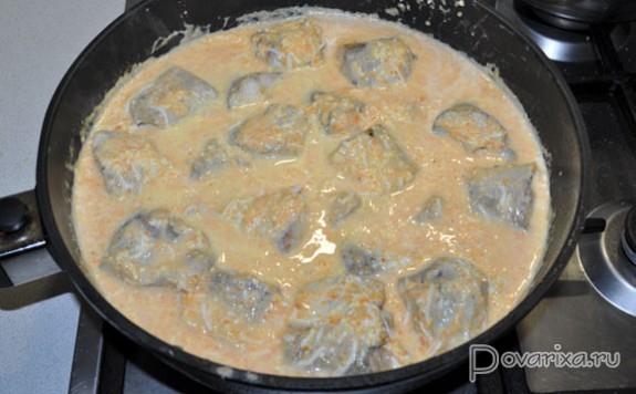 Из сковороды убираем лавровый лист. Оставляем на огне минут на 8-10, до выпаривания лишней жидкости. Перед окончанием ставим в микроволновку для кипячения сливки.