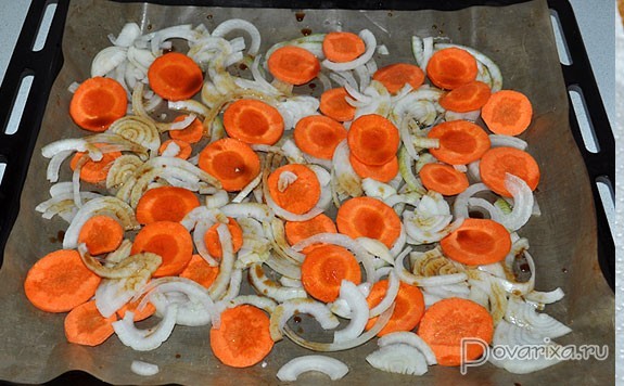На противень или форму для запекания раскладываем лук и морковь. Сбрызгиваем соевым соусом, перчим при желании.