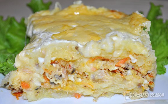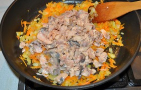 В большой сковороде, разогретой с маслом, на среднем огне пассеруем 7-8 минут нашинкованный средним кубиком лук и натертую морковку. Добавляем вынутую из банок и слегка размятую рыбу, у нас это – горбуша. Посыпаем Итальянскими (или Прованскими) травами, перцем, слегка солим, перемешиваем, выключаем огонь.