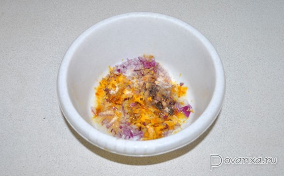 Мелко рубим луковицы, чеснок (если берем свежий), добавляем все остальные ингредиенты, вымешиваем маринад.