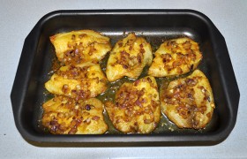 Через 15-20 минут (можно позже) раскладываем филе в промазанной маслом форме и ставим повыше середины в разогретую до 200° духовку.