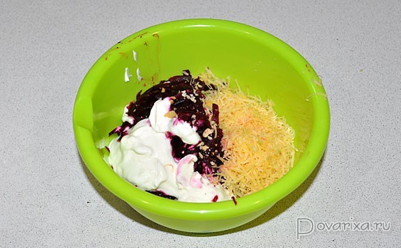 Складываем в мисочку свеклу, сыр, изюм, орехи, измельченный чеснок, сыплем щепотку соли и кладем сметану.