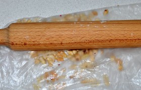 Орехи (сорт на свой выбор) слегка обжариваем на сухой сковородке (по желанию), дробим на мелкие кусочки в пакете с помощью скалки или делаем это в блендере.