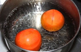 Ставим кастрюльку с водой, в которую, когда закипит, опускаем надрезанные помидоры.