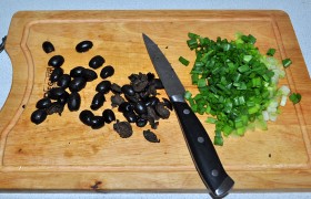 Мелко рубим зеленый лук. Маслины без косточек нарезаем колечками. Если нашлись, как у нас, только с косточками – несильно надавливаем каждую плоскостью ножа, после чего легко извлекаем ядрышки и получаем половинки маслины.