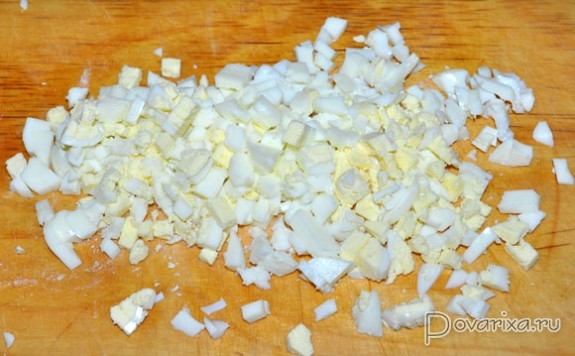 Успевшие свариться и остуженные в холодной воде яйца превращаем тоже в мелкие кубики.