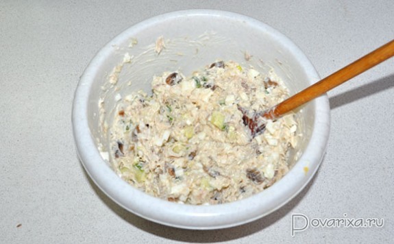 Смешиваем с майонезом, которого в этом салате много не требуется, пробуем на соль. Салат со скумбрией готов.