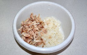 Пока варятся рис (20-22 минуты) и яйца (9-10 минут), занимаемся скумбрией. Удаляем кожу, кости, мякоть разбираем некрупными волокнами.