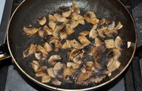 Разогреваем масло в сковороде на огне чуть больше среднего, помешивая, обжариваем 4-5 минут нарезанные грибы. Солим, перекладываем на тарелку для остывания.