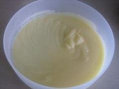 Итак, в новом варианте начинаем с того же самого - растирания желтков с сахаром. Ложку муки или крахмала разводим полустаканом холодного молока, смешиваем с растертыми желтками и не спеша вливаем остальное молоко - уже горячее.