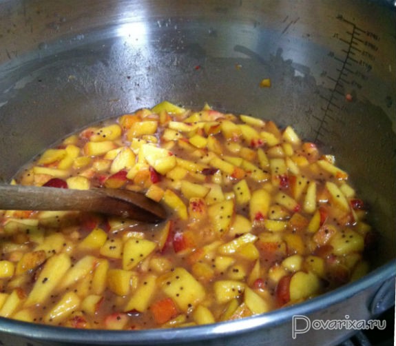 - Убедившись, что крупинок не осталось, закладываем персики и тушим, продолжая часто помешивать, около 20 минут, когда персики начнут становиться мягкими.
