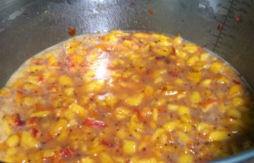 - Закончив мойку, чистку (в том числе и кожицы) и нарезку персиков - смешиваем все остальные компоненты соуса в кастрюле, сразу, когда закипит, начинаем помешивание, чтобы помочь раствориться сахару.