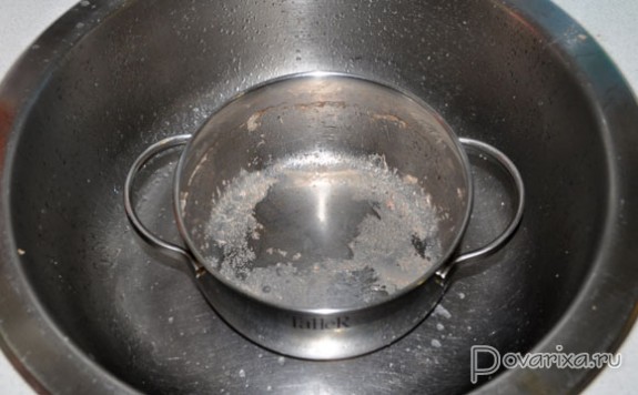 Сливаем воду с мясом: посмотрите, как выглядит дно нашей кастрюли. Отмываем ее – обратите внимание, как сильно эти грязные хлопья прилипли к металлу, и это за 3-4 минуты.