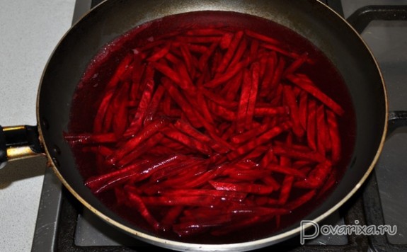 В этом борще дольше всего готовится свекла, так что с нее и начинаем - еще минут за 20 до того, как начнется основная готовка. Берем терку, после которой свекла превращается в тонкие брусочки.