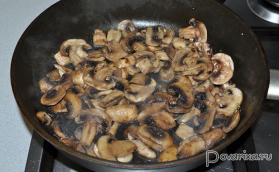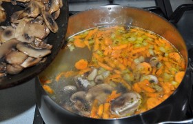 Тем временем на одной сковороде у нас пассеруются мелко нарезанные овощи: лук, сельдерей и морковь (ее можно натереть), время – 7-8 минут, огонь – средний. Добавляем к заправке 1-2 половника бульона, тушим 3-4 минуты, выключаем.