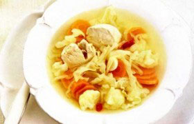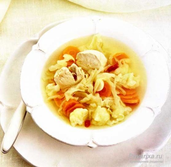 - Из готового бульона вынимаем грудки, убираем морковь и лук, тщательно процеживаем бульон и - снова на огонь. Закипело - кладем в бульон цветную капусту, через 5 минут добавляем морковь и после закипания варим тоже 5 минут.