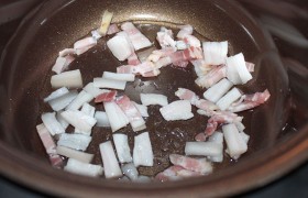 В нагревшуюся чашу выкладываем бекон, ставим на 30 минут режим выпечки.