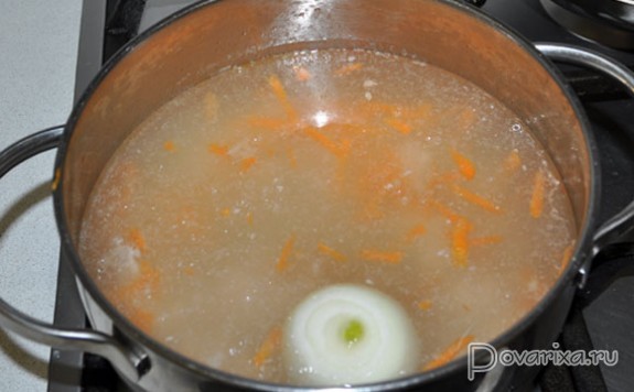 Мясо без кости нарезаем, возвращаем в бульон. В закипевший - крошим бульонный кубик, кладем луковицу и тертую морковь.