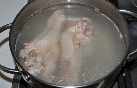 Кладем 2 плеча индейки, заливаем холодной водой, доводим до кипения. Через 2 минуты сливаем воду, все промываем, ставим заново вариться на малом огне до готовности. Из двух кусков (750 г) получился бульон для 2 супов. Половину заморозили.