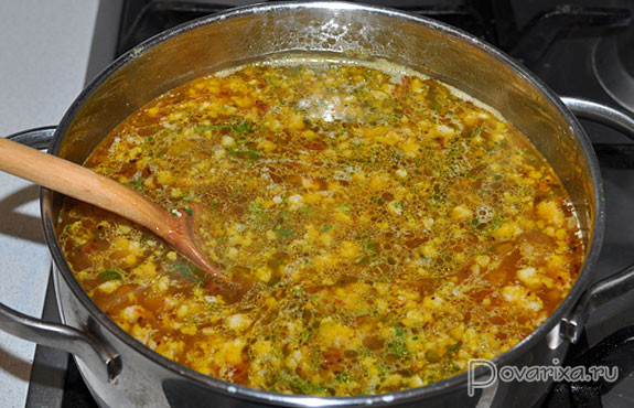 Заправку выкладываем в суп. Пробуем, бросаем рубленую зелень.