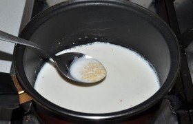 В кипящее молоко засыпаем промытую кипятком пшенку, посыпаем сахаром и солью, варим до готовности крупы, укрыв полотенцем, даем распариться и немного остыть.