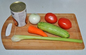 Пока на среднем огне конфорки разогревается масло, для суповой заправки мелко рубим лук и сельдерей, высыпаем в сковороду и, периодически помешивая, пассеруем 5-7 минут, до мягкости овощей.
