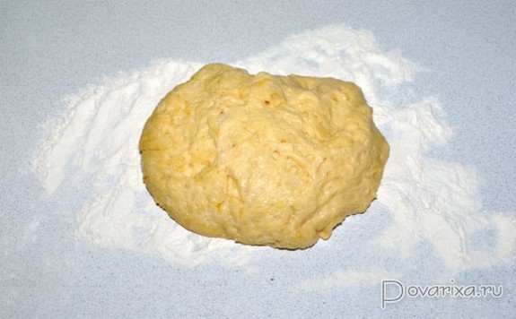 Пришло время - выкладываем на стол, присыпанный мукой. Тесто хорошо подошло, легкое и мягкое.