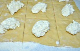 На каждый квадратик теста кладем примерно 2 ст. ложки творога.