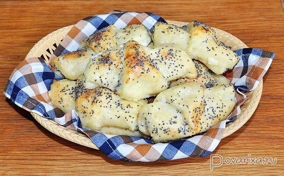 Чтобы оно не прилипало к поверхности, подсыпаем её мукой. Раскатываем осторожно в круг, без лишнего нажима, до толщины 7-8 мм. Нарезаем на 8 равных частей. Посыпаем маком.