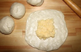 Разогреваем чугунную или хорошую толстостенную сковороду, установив огонь чуть больше среднего, не спеша, примерно по 5 минут, печем на каждой стороне. Перевернув, пропеченную сторону смазываем растопленным маслом, а, выложив на тарелку – и другую сторону. Такие хачапури с сыром подаются на стол немедленно.
