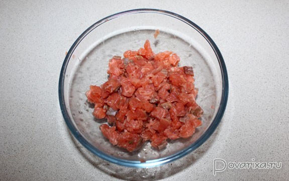 Делим вымытое и обсушенное филе горбуши пополам. Одну часть мелко нарезаем, кладем в миску, сбрызгиваем лимонным соком и отставляем. Перед выкладкой на тесто кусочки рыбы солим по вкусу.