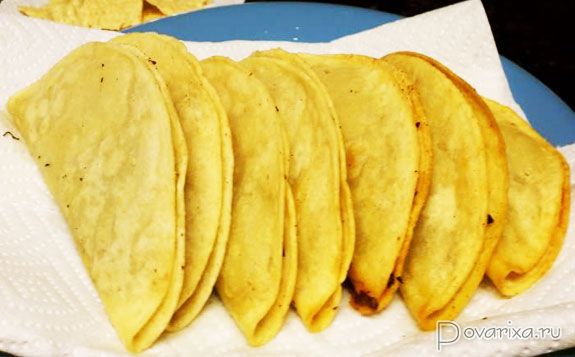 - На конфорке рядом нагреваем сухую сковороду. Кладем на нее тортилью, прогреваем по 40-50 секунд с обеих сторон – и погружаем в кипящее масло на несколько секунд, чтобы лепешка покрылась им, вынимаем, ждем, пока с лепешки сольется масло, кладем на тарелку.