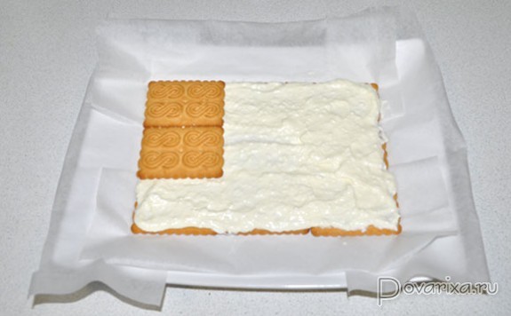 И так – до самого верха. Сохраняем немного крема и печенья. Оставляем торт на столе до пропитки, время - разное в зависимости от толщины и твердости печенья. Проверяем, прокалывая зубочисткой. Готов - кремом обмазываем бока торта, остатки - на верх. Крошим печенья в пакетике скалкой, обсыпаем верх и бока. Вот теперь ставим на часок в холодильник.