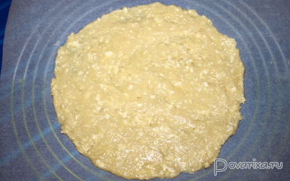 На листе пекарской бумаги очерчиваем круг диаметром 20-22 см. Четвертую часть теста выкладываем на бумагу и ровным слоем размазываем по кругу, что удобно делать лопаткой, смазанной растительным маслом.