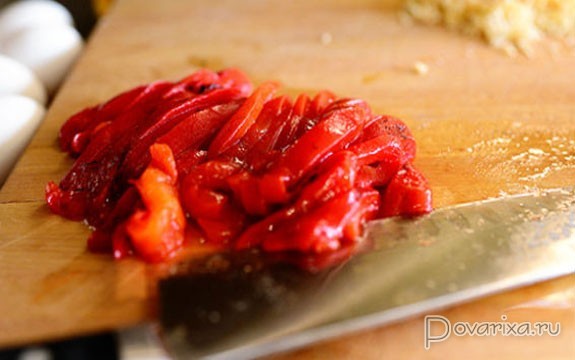 Превращаем в длинную соломку сладкий перец. И нарезаем маслины.