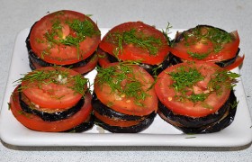 Сверху – кружок помидора, посыпанный укропом. Кстати, помидоры стоит немного посолить. Снова баклажан, помидор и зелень. На этом можем остановиться, а можем сделать каждую порцию еще выше.