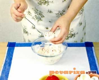 - Измельчаем желтки м смешиваем с мясными кусочками.