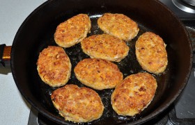 На средне-сильном огне 4-5 минут перекаливаем в сковороде масло. Кладем котлеты, жарим до корочки 3-4 минуты. Так же жарим вторую сторону котлет, выключаем огонь и держим котлеты 5 минут под крышкой. Они готовы.