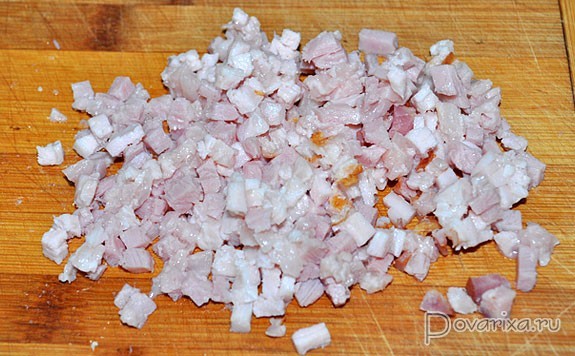 С грудинки удаляем кожу и нарезаем мякоть мелким кубиком (4-5 мм).