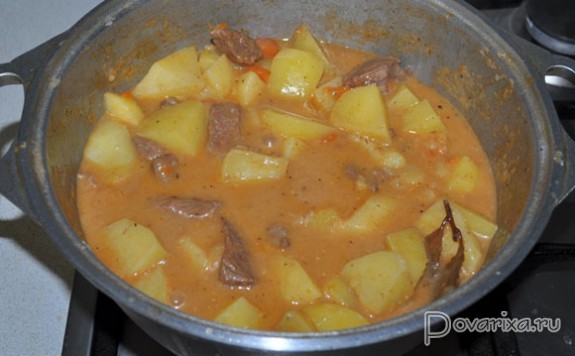 Добавляем к говядине, вливаем воды - чтобы почти скрыла мясо, бросаем лавровый лист, приправляем перцем, солью. Закрываем и оставляем тушиться на небольшом огне почти до полной мягкости.