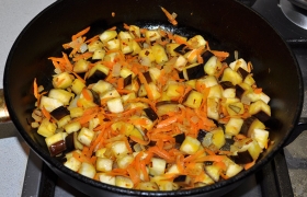 Сковороду с маслом разогреваем на сильном огне, всыпаем нашинкованный мелким кубиком лук, помешивая, обжариваем 4-5 минут. Добавляем крупно тертую морковь, обжариваем еще 3-4 минуты.