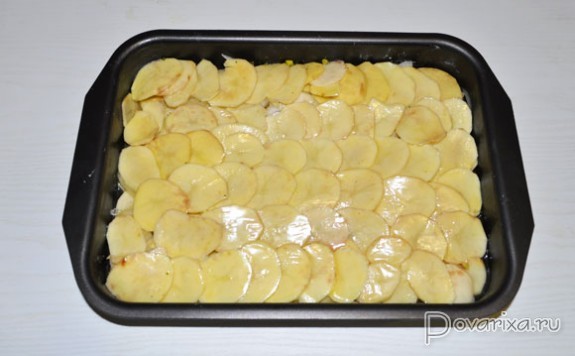Форма лучше всего – керамическая, за неимением таковой – готовим в металлической, дно и стенки которой сначала промазываем кусочком сливочного масла. Выкладываем слой ломтиков с небольшим «заходом» одного на другой. Сверху – кольца лука.